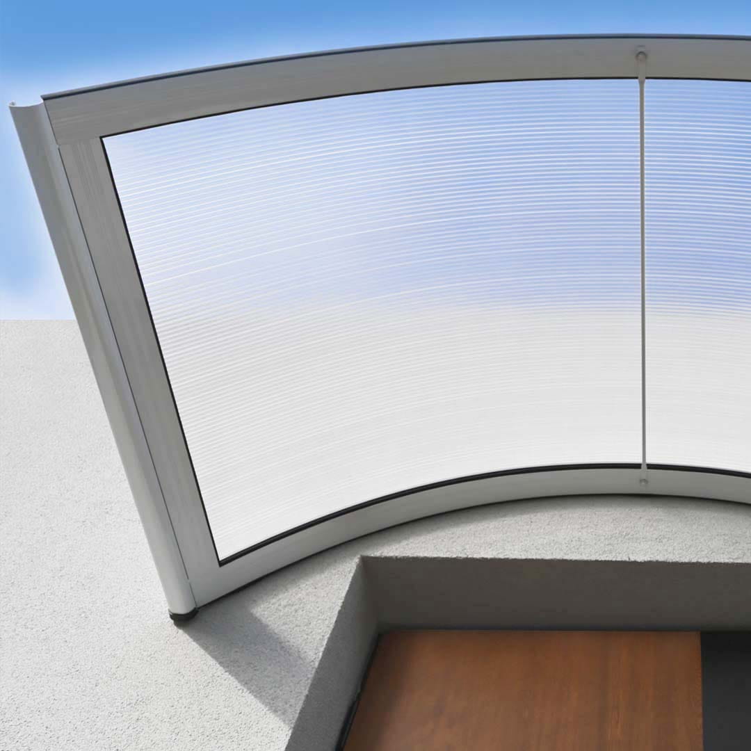 Zadaszenie drzwi wykonane z profili aluminiowych malowanych proszkowo, wypełnienie stanowi płyta komorowa z poliwęglanu o gr. 4,5mm. Daszek przeznaczony jest do samodzielnego montażu - to lekkie zadaszenie drzwi instaluje się pewnie i bez wysiłku za pomocą niewielkiej ilości elementów. Zadaszenia jeśli jest taka potrzeba można uzupełnić o montaż ścianki bocznej, którą można zamocować po prawej lub lewej stronie daszka lub po obydwu jego stronach tworząc w ten sposób estetyczny wiatrołap.