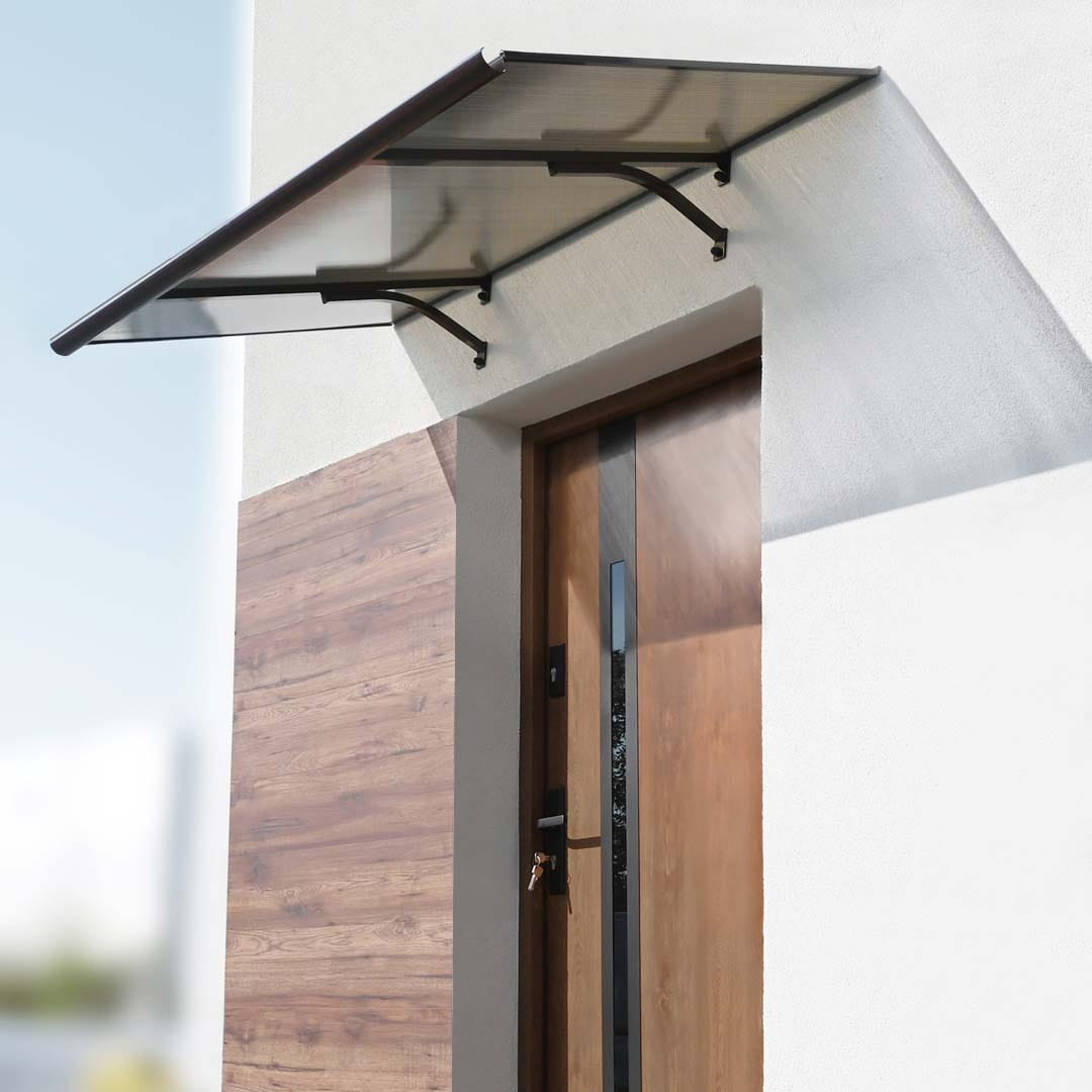 Daszek wykanany z profili aluminiowych malowanych proszkowo, wypełnienie stanowi płyta komorowa z poliwęglanu o gr. 4,5mm. Zadaszenie drzwi wejściowych stanowi ważny element elewacji budynku. Wybierając daszek, warto pamiętać, że powinien on pasować do fasady budynku. Zadaszenia chronią drzwi przed niekorzystnymi warunkami atmosferycznymi, takimi jak deszcz, grad czy nasłonecznienie. Zadaszenia jeśli jest taka potrzeba można uzupełnić o montaż ścianki bocznej, którą można zamocować po prawej lub lewej stronie daszka lub po obydwu jego stronach tworząc w ten sposób estetyczny wiatrołap. Większość producentów drzwi, aby udzielić gwarancji, wymaga zamontowania daszka.