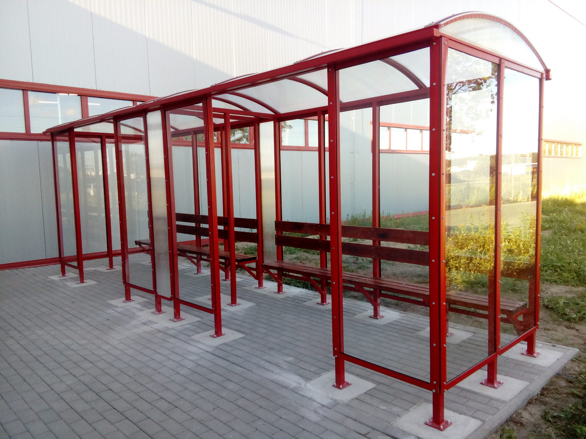 Wiata zamocowana na betonowych stopach fundamentowych.